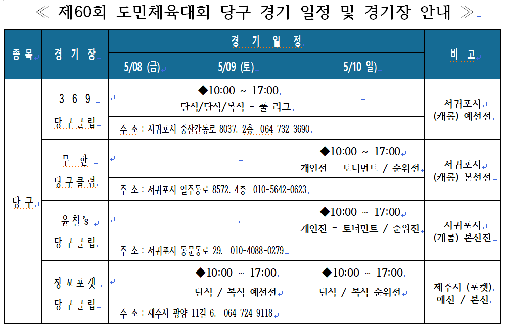 | (당구 4개장소) 도민체전 세부경기일정_369당구클럽,무한당구클럽,윤철's당구클럽,창꼬포켓당구클럽 작성자 : 제주특별자치도체육회 등록일 : 2026-04-22 13:39:56 조회수 : 76 |